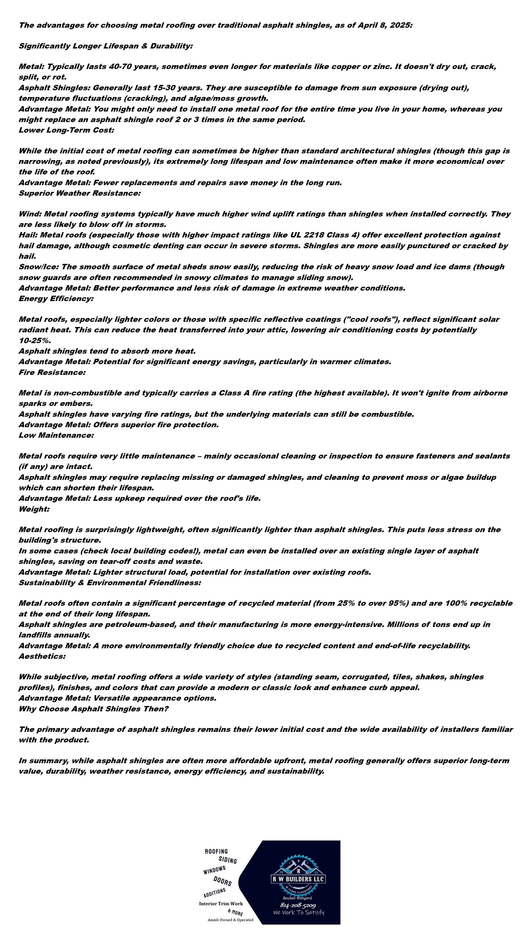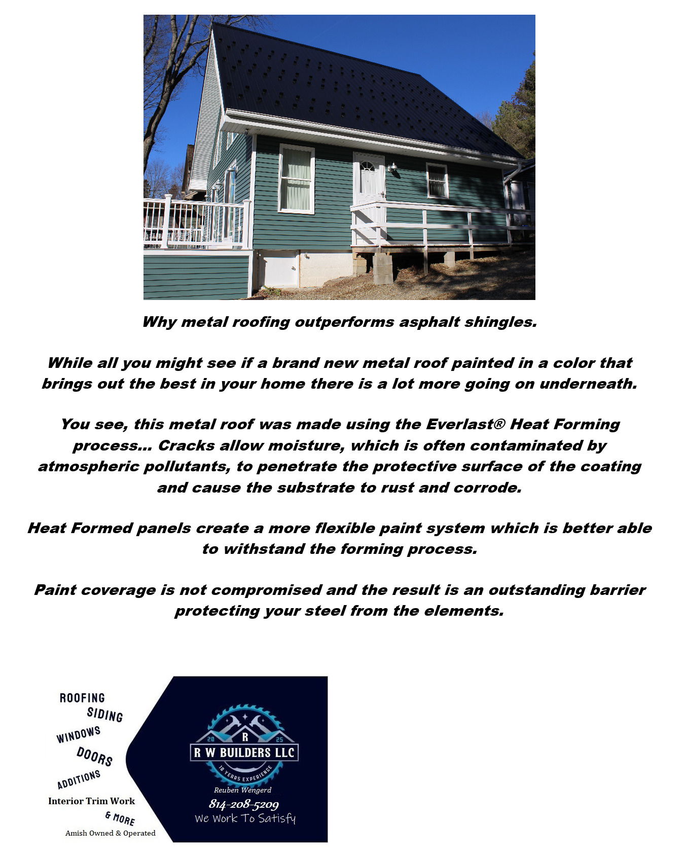 Engage Our Metal Roofing Specialists Today: RW builders stands as the contractor of choice for discerning property owners seeking expert metal Roofing solutions in Erie, Spartansburg, Meadville, Titusville, PA, and the surrounding regions. As an Amish-owned company, our foundation is built upon a commitment to meticulous craftsmanship and superior quality across all roofing and general contracting services. While specializing in metal roof installations and repairs, our expertise also encompasses shingle roof replacements, repairs, and comprehensive general contracting.Whether undertaking new construction or planning a vital roof replacement, consider the lasting value and performance of metal roofing. Contact our specialists at Rw Buildsers today to discuss your project requirements and explore the benefits of a durable, high-performance metal roof for your home That will last the rest of your life!